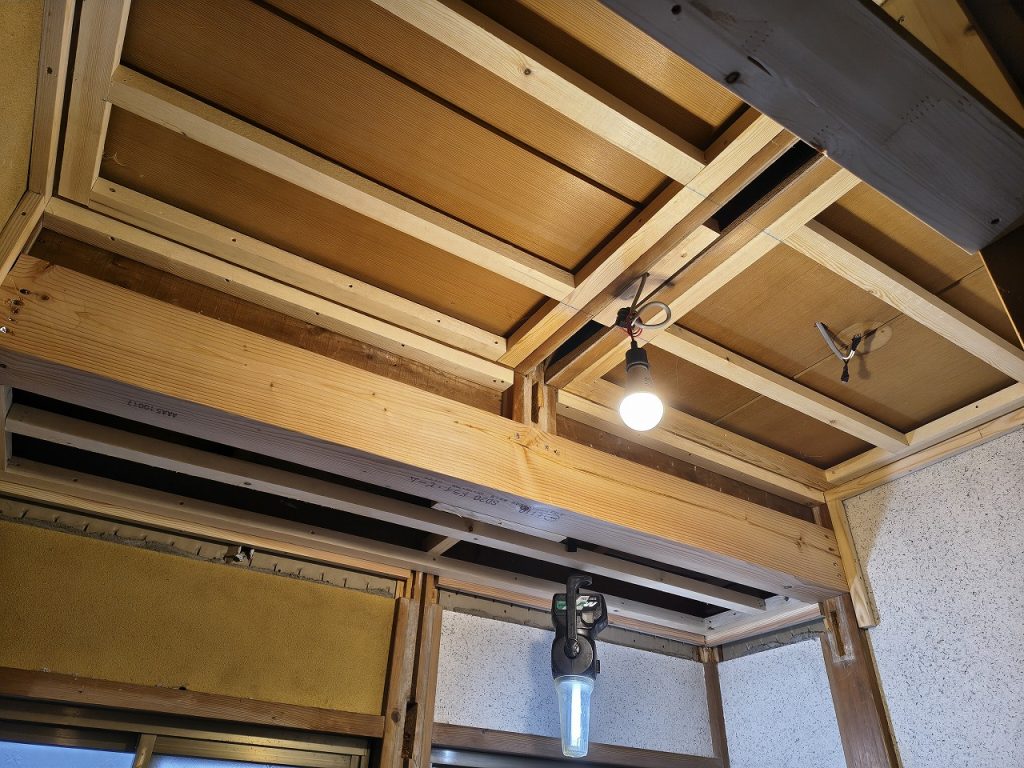 天井の全面にべニアを張ります。今回、天井仕上がりが壁クロス貼りのため、天井の凹凸を平滑にする役割もあります。