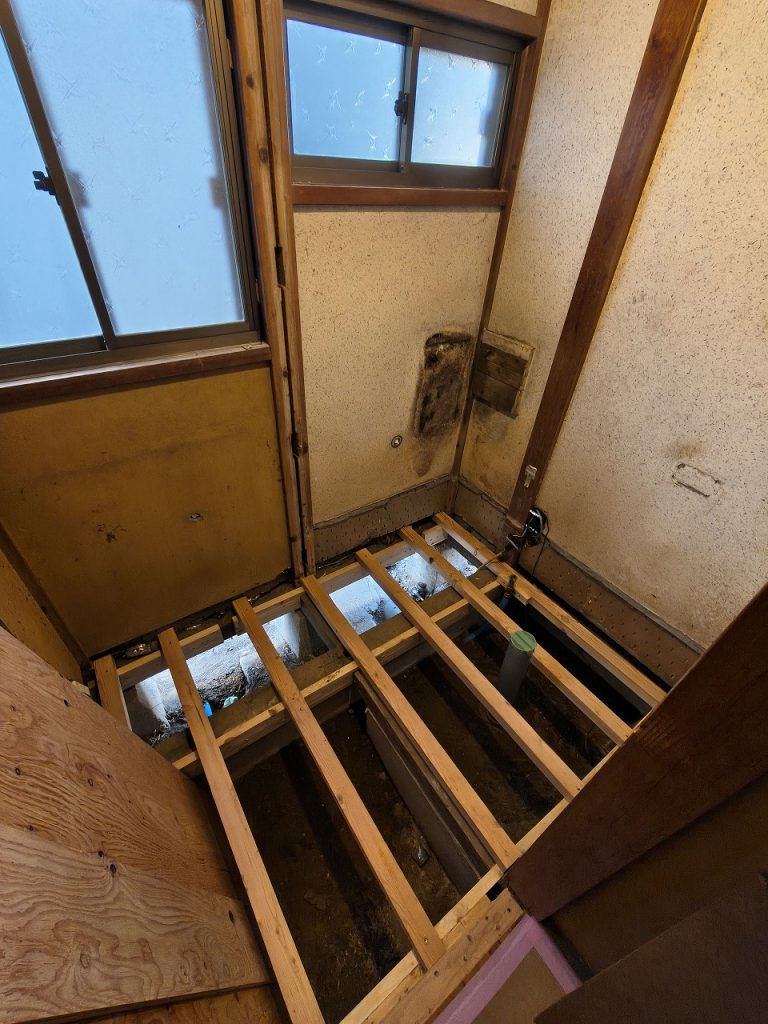 既存フローリングの一部が、長年に湿気により腐り始めていた為、該当箇所のみ既存フローリングを撤去して補修します。