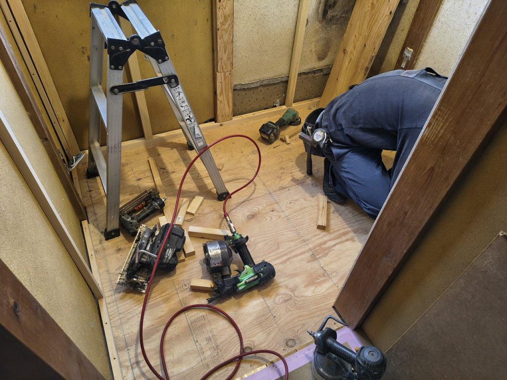 床の仕様として、既存フローリングはそのままに、その上から新規フローリングを張るカバー工法で今回は行います。